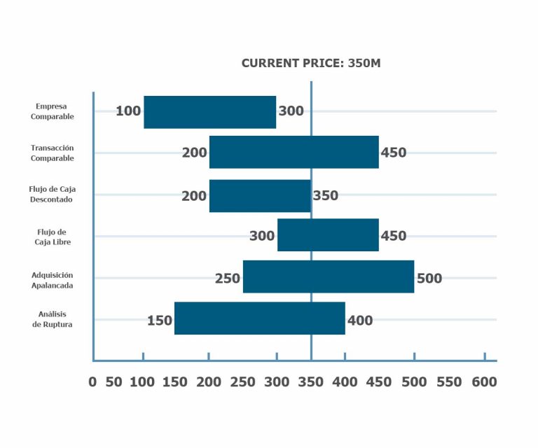 Ejemplo, imagina que el precio actual de tu empresa es de 350 millones, pero quieres saber su valor. Al aplicar el campo de fútbol de valoración, observamos que, dependiendo del método de valoración, los rangos de valor muestran hasta dónde puede llegar el precio de tu empresa. Esto nos permite saber el margen de maniobra que tendrás a la hora de negociar con el comprador.