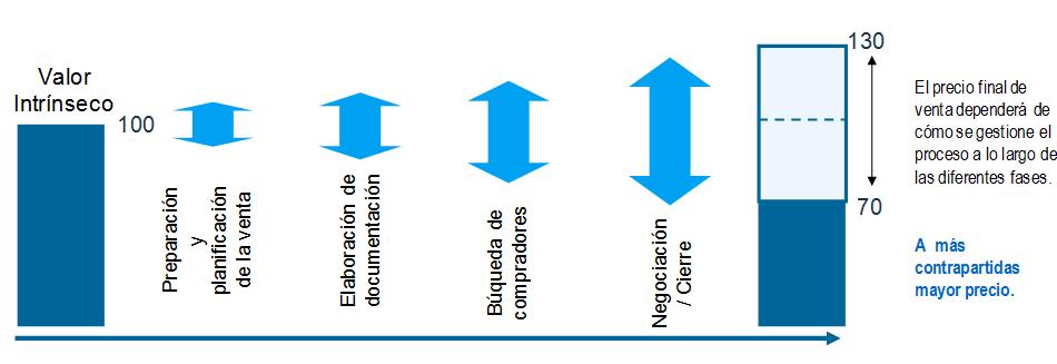 La calidad con que la que se aborde cada una de las fases influirá de manera determinante en el precio final. Con un valor intrínseco de 100 de una compañía, un proceso mal gestionado puede provocar que la compañía se venda por 70, mientras que un buen proceso elevará el valor hasta 130. Casi un 100% de diferencia.