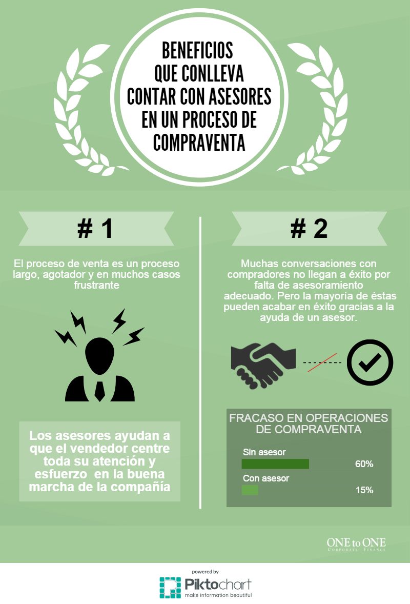 Contar con asesores que liberen tiempo resulta de extraordinaria importancia para que el empresario se enfoque en el negocio y ellos realicen con eficacia su trabajo. Contar con asesores supone la utilización de una metodología para maximizar la calidad del proceso de presentación de la información, búsqueda de candidatos y negociación, así como cierre satisfactorio de la transacción.