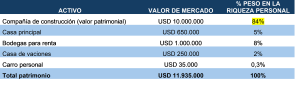 Ahora, como puedes observar, el 84% de sus activos personales están vinculados a la empresa de construcción. Esta ha generado la mayoría de los otros activos. Además, le proporciona un ingreso estable y una buena calidad de vida.