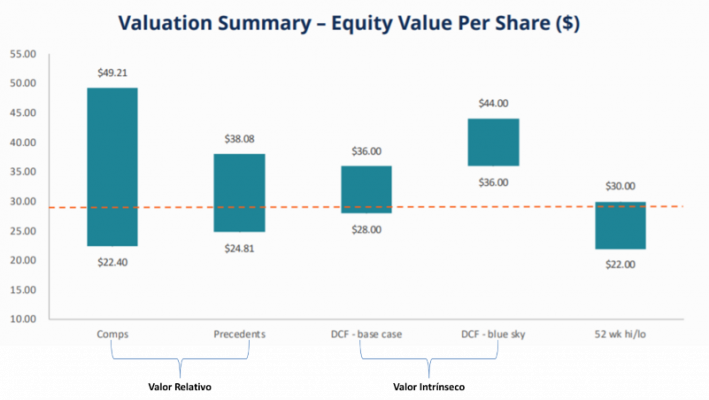 REGLA UNIVERSAL – Se paga por las acciones de una empresa lo que el mercado quiera y cómo lo quiera pagar. Es muy probable que diferentes metodologías lleguen a diferentes resultados. Regularmente se utilizan varios métodos de valoración para evaluar cada argumento de valor y se presentan en un gráfico conocido como Football Field (aludiendo a su parecido a un campo de fútbol americano).